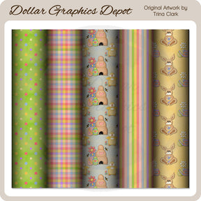 Esta colección incluye cinco papeles de desecho de Pascua de 12" x 12". Los patrones incluyen: lunares, cuadros, pollitos de Pascua, colmenas, abejas, flores de primavera y huevos de Pascua pintados, rayas y conejitos de Pascua, flores de primavera y huevos de Pascua pintados. TENGA EN CUENTA: Este conjunto se coordina con las colecciones "Easter Splash 1 - Clip Art" y "Easter Splash - Background Tiles" . Este juego contiene 5 papeles para álbumes de recortes.