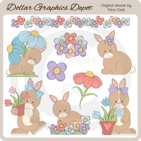 Esta colección incluye adorables conejitos de jardín, parches de césped, bonitas flores primaverales, macetas de barro llenas de tulipanes y un colorido borde floral. TENGA EN CUENTA: Este conjunto coordina con las colecciones "Garden Bunnies 1 - Scrap Papers" y "Garden Bunnies 1 - Sellos digitales" . Este conjunto contiene 9 gráficos.