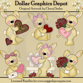 Esta colección incluye seis conejitos de San Valentín andrajosos, algunos con bonitos lazos para el pelo, una caja de bombones en forma de corazón, un pequeño corazón rojo, corazones rosados ​​y rojos con volantes blancos, ramos de rosas rojas, una tarjeta de San Valentín en un sobre, una valla blanca. y bonitas flores rojas. Este conjunto contiene 6 gráficos.