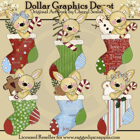 Esta colección incluye seis conejitos andrajosos, seis medias navideñas con bonitas rayas, cuadros, diseños navideños de palabras, copos de nieve y lunares, ramas de acebo, bastones de caramelo, un mini árbol de Navidad, un pequeño muñeco de nieve, caramelo de menta, un hombre de jengibre, y galletas navideñas decoradas: un hombre de jengibre, un muñeco de nieve y un bastón de caramelo. Los colores incluyen: rojo, verde, azul, blanco, marrón, amarillo y tostado. Este conjunto contiene 6 gráficos.