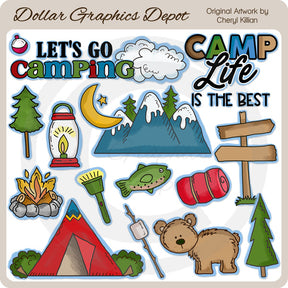 Esta gran colección incluye dos pinos, un oso pardo, un farol, una linterna, una trucha, un corcho de pesca, un saco de dormir, un cartel de madera para el sendero, una fogata, un malvavisco en un palo, una tienda de campaña con arbustos verdes, montañas con nieve y pinos, una luna y una pequeña estrella, nubes hinchadas y dos gráficos con palabras para acampar: "Let's Go Camping" y "Camp Life Is The Best". Este conjunto contiene 17 gráficos.