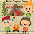Esta colección incluye una chica de campamento con una mochila y una linterna, una chica de campamento con un malvavisco en un palo, un chico de campamento con un malvavisco asado en un palo, una fogata, un pino, una tienda de campaña, una linterna con iluminación transparente, y un gráfico con la palabra "Gone Camping". Este conjunto contiene 8 gráficos.