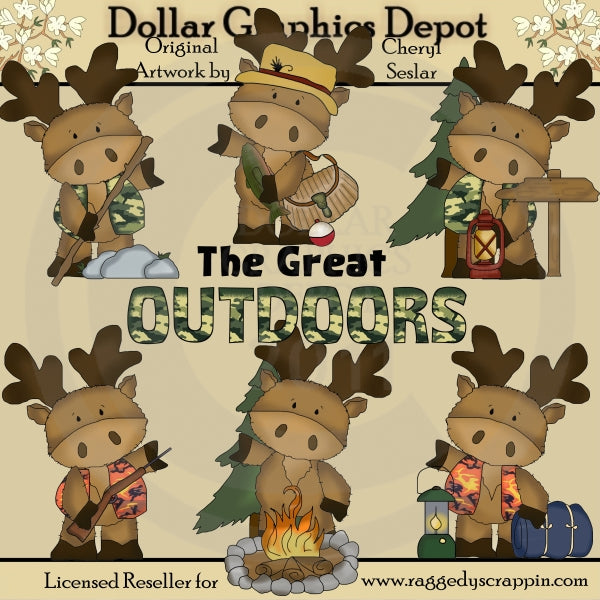 Esta colección incluye seis adorables alces del bosque con chalecos de camuflaje, un bastón, adoquines, un pez, un sombrero de pesca, una bolsa para peces, un corcho, pinos, linternas para acampar, un letrero de madera (para personalizar), un mosquete, una fogata, un saco de dormir y un gráfico de camuflaje con la palabra "The Great Outdoors". Este conjunto contiene 7 gráficos.
