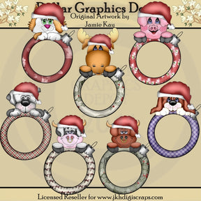 Esta colección incluye siete marcos de adornos navideños: un gatito, un alce, un cerdo, dos cachorros y dos vacas, cada uno con gorro de Papá Noel. Tenga en cuenta: este conjunto también incluye siete marcos ornamentales con el centro (solamente) lleno, para que pueda agregar su propia personalización, como texto, gráficos, elementos, arte de palabras, etc. Este conjunto contiene 7 gráficos.