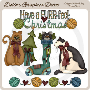 Esta colección incluye adorables gatitos navideños con bonitos lazos, un árbol de Navidad con una estrella dorada en la parte superior, un regalo de Navidad envuelto, un calcetín navideño con hojas de acebo y un bastón de caramelo, un borde de hilo y corazón, y un "Have A Purr-". Gráfico de arte de palabras "Navidad perfecta". Este conjunto contiene 5 gráficos.