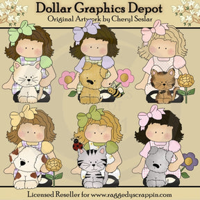 Esta colección incluye seis niñas adorables, vestidas con vestidos tipo jersey de cuadros, cuadros y flores, blusas a juego y lindos lazos para el cabello, tres lindos gatitos, tres lindos cachorritos, lindas flores, una mariquita y un abejorro. Este conjunto contiene 6 gráficos.
