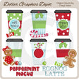 Esta colección incluye seis tazas de café navideñas para llevar: una con un patrón de lunares, una funda "Mint Mocha" y un caramelo de menta, otra con un patrón de rayas, una funda verde, una hoja de baya de acebo y un bastón de caramelo. , uno con un patrón de lunares y una funda de "Eggnog Latte", una taza azul con una funda verde, gomitas y una dama de jengibre, una taza azul, una manga festoneada, bayas de acebo y una pastilla de goma, una taza azul con una manga roja, una hoja de acebo, un caramelo de menta y un hombre de jengibre, y dos gráficos con palabras: "Peppermint Mocha" y "Eggnog Latte". Este conjunto contiene 8 gráficos.