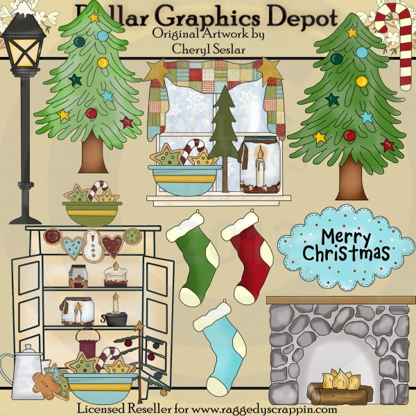 Esta colección incluye dos árboles de Navidad decorados, tres medias navideñas, un bastón de caramelo a rayas, un poste de luz nevado, una chimenea de adoquines con un fuego calentito, una ventana navideña con bonitas cortinas de patchwork y alzapaños de estrellas, un plato de galletas navideñas, un mini pino y un tarro para velas con pepitas y estrellitas doradas, un armario rústico con una cafetera, galletas navideñas, un mini árbol de Navidad decorado, cuencos llenos de galletas navideñas, un candelabro de metal "perforado", una vela frasco con bayas de pepita y estrellitas doradas, una lámpara de vela de metal con detalles decorativos, un frasco de vidrio lleno de bayas de pepita y hombrecitos de jengibre, un candelabro de metal con una vela gruesa, bayas de pepita y ramas de canela, y una guirnalda de galletas, y un gráfico de palabras "Feliz Navidad". Este conjunto contiene 11 gráficos.