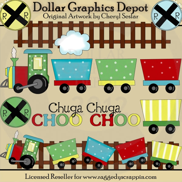 Esta gran colección incluye un juego de cinco piezas de tren choo-choo, tres señales de cruce de ferrocarril, vías de tren, nubes hinchadas, un tren sobre las vías del ferrocarril y un gráfico de palabras "Chuga Chuga Choo Choo". Este conjunto contiene 12 gráficos.