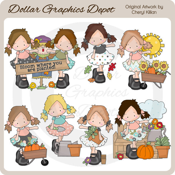 Esta colección incluye adorables niñas otoñales con bonitos vestidos estampados, un espantapájaros, un letrero de madera con la leyenda "Florece donde estás plantada" pintado, bonitas flores, coloridas hojas otoñales, el sol, ruedas de madera, calabazas otoñales y bonitos girasoles. , regaderas, una pala de jardín, vasijas de barro, plantas en macetas, una nube y un banco de madera. Este conjunto contiene 7 gráficos.