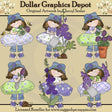 Esta colección incluye seis dulces niñas, que usan bonitos vestidos, pantalones capri y sombreros florales a juego, con estampados de cuadros, rombos, cuadros, corazones, pata de gallo y florales, en blanco, melocotón, verde y morado, con muchas hermosas flores de color violeta. , una maceta de barro, una pala, regaderas de jardín, pequeños caracoles y abejorros. Este conjunto contiene 6 gráficos.
