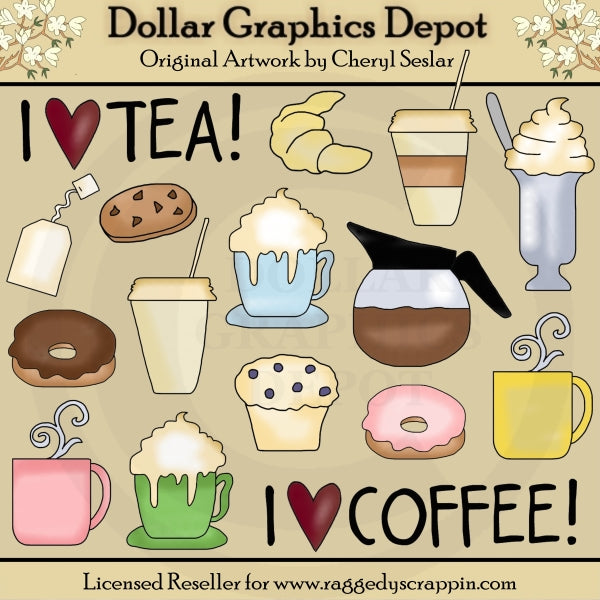 Esta gran colección incluye tazas de café/té caliente, tazas de café/té para llevar, una taza alta llena de capuchino/té chai con leche y crema batida, una taza y platillo rellenos de capuchino/té chai con leche con crema batida. , donas glaseadas, un croissant, una galleta con chispas de chocolate, un muffin de arándanos, una bolsita de té y dos gráficos con palabras "I Love Tea" y "I Love Coffee". Este conjunto contiene 16 gráficos.