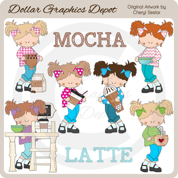 Esta colección única solo está disponible en Digital Craft Supplies. Esta colección incluye adorables chicas adolescentes, vestidas con jeans remangados, bonitas blusas estampadas y lazos para el cabello a juego, tazas pintadas llenas de café caliente, una bolsa de granos de café, granos de café, tazas de café para llevar, un moca helado con crema batida. y jarabe de chocolate, una mesa de madera, una silla de madera, un menú de pizarra enmarcado y dos gráficos artísticos con palabras de café: "Mocha" y "Latte". Este conjunto exclusivo contiene 8 gráficos.