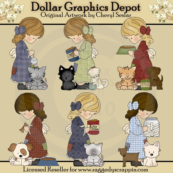 Esta colección incluye seis chicas de campo, con bonitos vestidos estampados y lazos para el pelo a juego, en azul, rojo, verde y marfil, lindos gatitos, adorables cachorritos, cuencos para perros llenos de comida para perros, un ratoncito de juguete para gatos, un ovillo de lana, comida para perros "Doggy Vittles", comida para gatos "Kitty Vittles", galletas para perros y un frasco lleno de huesos de perro. Este conjunto contiene 6 gráficos.