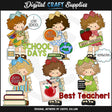 Esta colección única solo está disponible en Digital Craft Supplies. Esta colección incluye seis adorables colegialas, que llevan bonitos vestidos estampados y lazos para el cabello a juego: una con una caja de crayones, una botella de pegamento y un globo de diálogo "I Love School", otra con libros escolares, un globo terráqueo y un letrero de "Mejor Maestro", uno con una manzana roja y un letrero de "Mejor Maestro", uno con libros escolares y un letrero de "Súper Estudiante", uno con un crayón y un proyecto de arte, y otro con un lápiz, una calculadora y un bocadillo de diálogo "Tarea" y dos gráficos de palabras: "Días escolares" y "Mejor maestro". Este conjunto exclusivo contiene 8 gráficos.