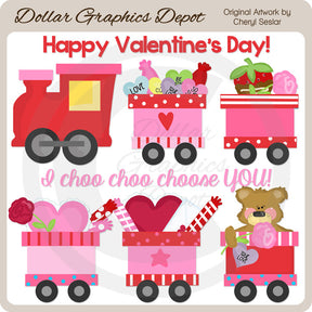 Esta colección incluye un tren chu-chú de San Valentín de seis piezas con corazones de conversación, dulces de San Valentín envueltos, una fresa cubierta de chocolate, rosas rosadas, una rosa roja, corazones festoneados rosados y rojos, una tarjeta del Día de San Valentín en un sobre, un muñeco de peluche. osito de peluche y dos gráficos con palabras de San Valentín: "Feliz día de San Valentín" y "I Choo Choo Choose You". Este conjunto contiene 8 gráficos.