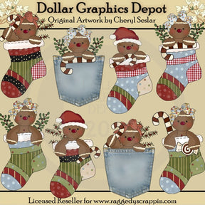 Aquí hay algunos ejemplos de lo que puedes crear usando estos gráficos de "Jengibres caprichosos - Medias navideñas":