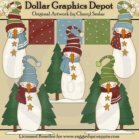 Esta colección incluye cinco muñecos de nieve caprichosos con gorros de invierno, bufandas, botones de estrellas doradas y narices de zanahoria, pinos, nieve y tres fondos de lunares a juego. Este conjunto contiene 8 gráficos.