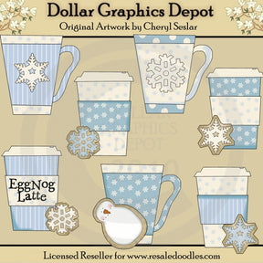 Esta colección incluye tres tazas de invierno azules y blancas y cuatro tazas de café para llevar, con rayas, lunares y copos de nieve, y galletas esmeriladas de copos de nieve y muñecos de nieve. Una taza para llevar tiene una palabra que dice "Eggnog Latte". Este conjunto contiene 7 gráficos.