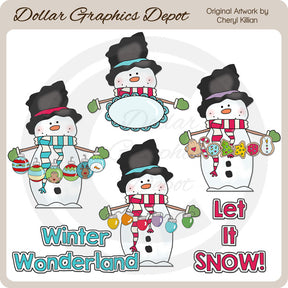 Esta colección incluye adorables muñecos de nieve con sombreros de copa, bufandas de invierno y manoplas, uno con un marco festoneado, otro con adornos navideños, otro con galletas navideñas decoradas y otro con una cadena de luces navideñas, y dos gráficos invernales con palabras: "Invierno". El país de las maravillas" y "Let It Snow". Este conjunto contiene 6 gráficos.