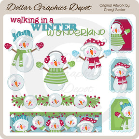 Esta colección incluye adorables muñecos de nieve de invierno con gorros de invierno, orejeras, un suéter de invierno, manoplas, bufandas, una linda carita de muñeco de nieve, un divisor de muñeco de nieve y bayas de acebo, un borde de muñeco de nieve y bayas de acebo, tres etiquetas de muñeco de nieve a juego y una "Walking". Gráfico de arte de palabras "In A Winter Wonderland". Este conjunto contiene 10 gráficos.