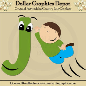 Esta colección incluye archivos de corte que se pueden usar para crear este proyecto educativo de artesanía de letras del alfabeto (que se muestra "terminado" en la vista previa). J es para Saltar: la letra "J" y un niño pequeño saltando.