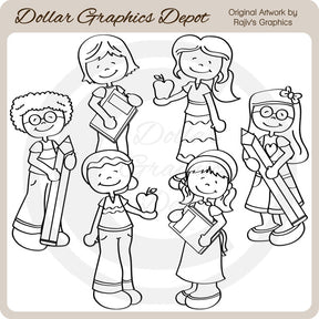 Esta colección incluye seis adorables escolares con bonitos atuendos, libros escolares, lápices y manzanas rojas. Este conjunto contiene 6 sellos digitales.
