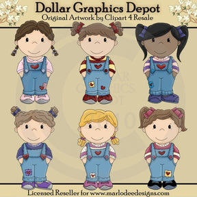 Esta colección incluye seis adorables niñas, vestidas con overoles de mezclilla azul, con pequeños parches de corazones, camisas de manga larga y lazos para el cabello a juego, en rosa, amarillo, rojo, azul, morado y blanco. Este conjunto contiene 6 gráficos.