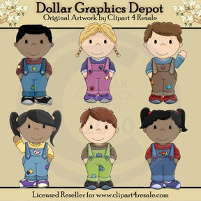 Esta colección única solo está disponible en Digital Craft Supplies. Este set incluye tres niños y tres niñas, vestidos con monos de colores, con muchos parches, en azul, marrón, rosa, morado, rojo, amarillo y verde. Este conjunto exclusivo contiene 6 gráficos.