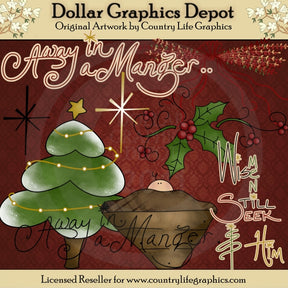 Esta colección incluye al niño Jesús en un pesebre, una estrella dorada brillante, una estrella negra, un bonito acento de hoja de baya de acebo, un árbol de Navidad con luces y una estrella dorada en la parte superior, coloridas ramitas navideñas atadas con un bonito lazo rojo, arte de dos palabras. gráficos: "Lejos en un pesebre" y "Los sabios todavía lo buscan", y un papel de fondo rojo y ornamentado. Este conjunto contiene 10 gráficos.