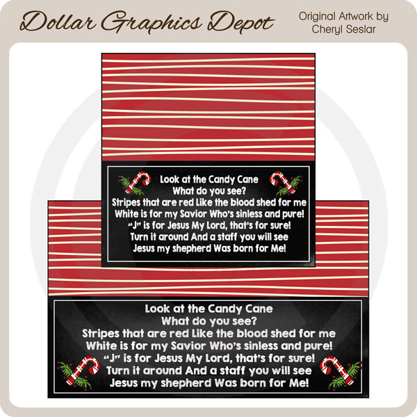 Esta colección incluye uno de 6,5" x 4" (6,5" x 2" cuando está plegado) y uno de 4" x 4" (4" x 2" cuando está plegado), adornos para bolsas de pizarra Candy Cane Legend, con rayas, bastones de caramelo y Texto en pizarra que dice: "Mira el bastón de caramelo. ¿Qué ves? Rayas rojas como la sangre derramada por mí. ¡El blanco es para mi Salvador, que es puro y sin pecado! "J" es para Jesús, mi Señor, eso es seguro. ¡Dale la vuelta y verás un cayado: Jesús, mi pastor, nació para mí! Este juego contiene 2 adornos para bolsas.