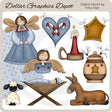 Esta colección incluye dos bonitos ángeles, el niño Jesús en un pesebre de madera, una vela roja en un candelabro, un cartel en forma de corazón con bastones de caramelo, un cartel en forma de estrella, un bonito frasco con ramitas y ramas de bayas, una oveja lanuda y un burro. y un fondo de coordinación. Este conjunto contiene 10 gráficos.