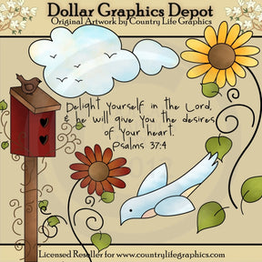 Esta colección incluye nubes hinchadas con pajaritos, una bonita casita para pájaros pintada, con ramas de hiedra enrolladas y un pajarito marrón, un girasol amarillo, un girasol rojo, un pájaro azul volando y un gráfico de palabras de las Escrituras: "Deléitate en el Señor". , y él te concederá los deseos de tu corazón - Salmos 37:4." Este conjunto contiene 6 gráficos.