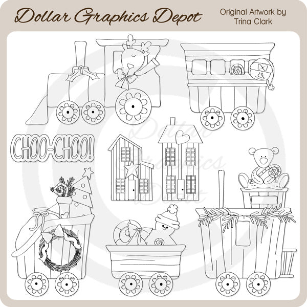 Esta colección incluye un tren chu-chu de cinco piezas con un reno, un muñeco de nieve, bastones de caramelo, un saco de Papá Noel lleno de golosinas, un calcetín navideño con un bastón de caramelo y ramas de pino, un árbol de Navidad decorado, una corona navideña y un muñeco de jengibre. , un lindo osito de peluche, una casa con una estrella, una casa con un corazón y un gráfico de palabras "Choo-Choo". Este conjunto contiene 8 sellos digitales.