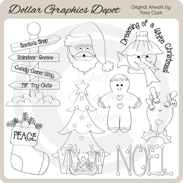 Esta colección incluye el Polo Norte con nieve esponjosa y carteles de madera que dicen: "Santa's Shop", "Reindeer Games", "Candy Cane Way" y "Elf Try-Outs", Santa Claus, un muñeco de nieve con "Dreaming Of A White". "Navidad", un calcetín "Paz" cosido y lleno de vegetación, un árbol de Navidad decorado con regalos envueltos, un osito de peluche y bastones de caramelo, un hombre de jengibre, un reno con adornos y un gráfico de palabras "Noel". Este conjunto contiene 8 sellos digitales.