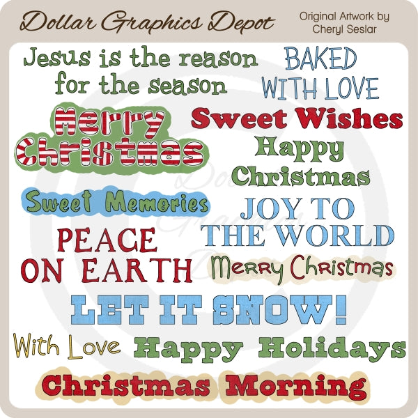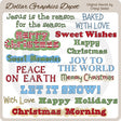 Esta colección incluye trece gráficos navideños con palabras: "Jesús es la razón de la temporada", "Al horno con amor", (2) "Feliz Navidad", "Dulces deseos", "Feliz Navidad", "Dulces recuerdos", "Alegría". Al mundo", "Paz en la Tierra", "Que nieve", "Con amor", "Felices fiestas" y "La mañana de Navidad". Este conjunto contiene 13 gráficos.