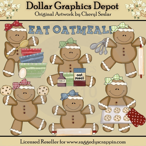 Esta colección única solo está disponible en Digital Craft Supplies. Este juego incluye seis damas de pan de jengibre con lindos lazos, galletas recién horneadas en una bandeja para hornear, tazones para mezclar, ingredientes para hornear, cucharas medidoras, rodillos, guante de cocina, cuchara de madera y un gráfico con la palabra "Eat Oatmeal". Este conjunto exclusivo contiene 7 gráficos.