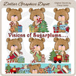 Esta colección incluye seis adorables osos navideños, regalos navideños envueltos con bonitos lazos, hombres de jengibre, bastones de caramelo, una galleta navideña helada, una cadena de luces navideñas, una piruleta de menta, árboles de Navidad decorados con estrellas doradas en la parte superior, un calcetín navideño, un un tazón lleno de galletas navideñas, un calcetín navideño con un hombre de jengibre y un bastón de caramelo, un caramelo de menta, un calcetín navideño lleno de bastones de caramelo, un tren chu-chu, un gráfico de palabras "Visions Of Sugarplums" y otro navideño a juego. borde. Este conjunto contiene 8 gráficos.