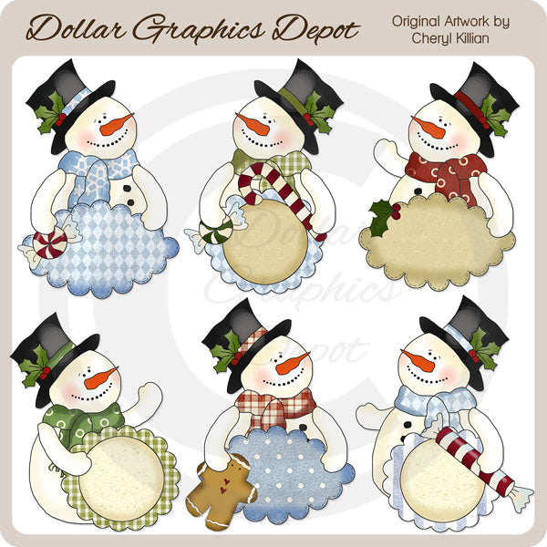 Esta colección incluye seis adorables muñecos de nieve, con sombreros de copa, bufandas de invierno, hojas de acebo, caramelos de menta, un hombre de jengibre y bonitos carteles navideños festoneados, para agregar su propia personalización. Este conjunto contiene 6 gráficos.