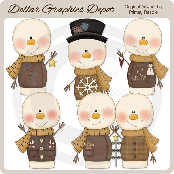 Esta colección incluye adorables muñecos de nieve de invierno, con abrigos y bufandas de invierno: uno tiene un adorno de estrella dorada y la palabra "Wish Upon A Star", uno tiene un sombrero de copa y un copo de nieve, otro tiene un adorno de corazón rojo, un pequeño muñeco de nieve y Arte de la palabra "Let It Snow", uno tiene bastones de caramelo a rayas y la pareja de muñecos de nieve tiene un hombrecito de pan de jengibre y un árbol de Navidad con una estrella dorada en la parte superior. Este conjunto contiene 5 gráficos.