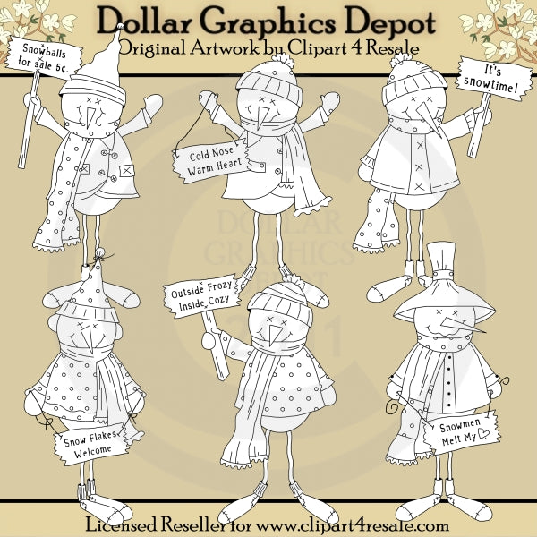 Esta colección única solo está disponible en Digital Craft Supplies. Este conjunto incluye seis muñecos de nieve de invierno, vestidos con bufandas, gorros, chaquetas, manoplas y calcetines de invierno, y seis carteles de invierno que dicen "Bolas de nieve a la venta por 5 centavos", "Nariz fría, corazón cálido", "Es hora de nieve", " Bienvenidos copos de nieve", "Fuera Frozy, dentro acogedor" y "Los muñecos de nieve derriten mi corazón". Este exclusivo set contiene 6 sellos digitales.