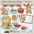 Esta gran colección incluye una linda niña con hombres de jengibre y un saco de harina, tres tazones para mezclar pintados, un hombre de jengibre con galletas con chispas de chocolate, una galleta de jengibre, un tubo de glaseado, una barra de menta, un hombre de jengibre con un saco de harina, un tazón lleno de galletas navideñas y una ramita de menta, un tazón lleno de galletas de jengibre, una señora de pan de jengibre con un rodillo, galletas navideñas en forma de corazón, un borde de galleta y palitos de menta, un gráfico con la palabra "Baked with Love", y dos tarjetas de recetas a juego. Este conjunto contiene 18 piezas (16 gráficos y 2 imprimibles).