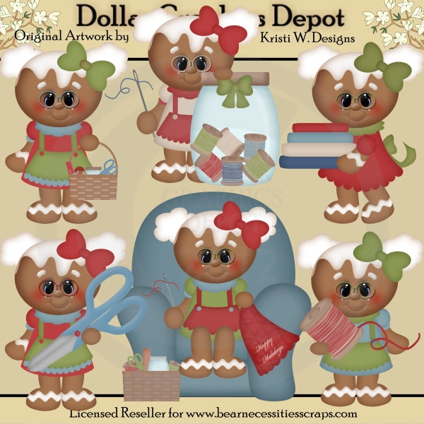 Esta colección única solo está disponible en Digital Craft Supplies. Este juego incluye seis adorables abuelas de pan de jengibre, con bonitos vestidos, delantales, lazos para el cabello y anteojos a juego, cestas tejidas llenas de suministros de costura/acolchado, agujas de coser con hilo, un frasco lleno de carretes de hilo de colores, una pila de coloridos tela, unas tijeras, un carrete de hilo, un sillón azul y una bonita colcha roja con costuras que dicen "Felices vacaciones". Este conjunto exclusivo contiene 6 gráficos.