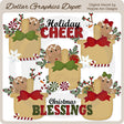 Esta colección incluye bonitas cestas navideñas con lazos rojos y verdes, hombres de jengibre, damas de jengibre, ramas de bayas de acebo, bastones de caramelo, copos de nieve, galletas navideñas, caramelos de menta, muñecos de nieve y dos gráficos navideños con palabras: "Holiday Cheer" y "Christmas Blessings". ". Este conjunto contiene 8 gráficos.