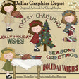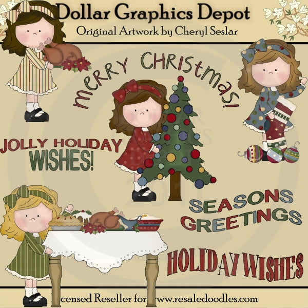 Esta colección incluye cuatro adorables niñas con bonitos vestidos navideños y lazos para el pelo a juego, un árbol de Navidad decorado, un pavo asado en una bandeja con detalles de flor de pascua, un bonito calcetín navideño, adornos navideños, una mesa de madera con un bonito mantel con ojales, un pavo asado, puré de papas, salsa, pastel de cerezas, pastel navideño y detalles de flor de pascua, y cuatro gráficos navideños con palabras: "Feliz Navidad", "Deseos de vacaciones alegres", "Saludos de temporada" y "Deseos de vacaciones". Este conjunto contiene 8 gráficos.