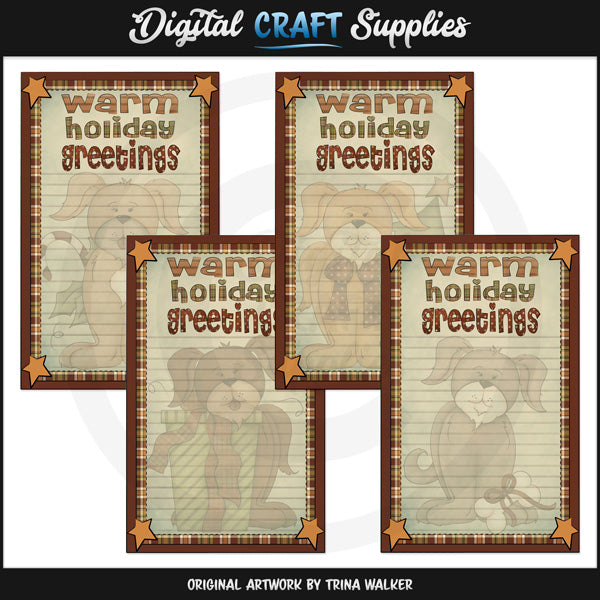 Esta colección incluye cuatro hojas estacionarias de 5" x 8", que representan lindos cachorritos navideños, un hueso de perro con una cinta roja, un regalo de Navidad envuelto con un bonito lazo, un árbol de Navidad con una estrella dorada en la parte superior y un bastón de caramelo con bayas de acebo. hojas. TENGA EN CUENTA: Este conjunto se coordina con "Holiday PuPPIes - Clip Art", " Holiday PuPPIes - Papeles de desecho", "Holiday PuPPIes - Tarjetas", "Holiday PuPPIes - Etiquetas", "Holiday PuPPIes - Sobres de tarjetas de regalo", "Holiday PuPPIes - Envoltorios para cupcakes", "Cachorros navideños - Etiquetas de firma", "Cachorros navideños - Bloques" y "Cachorros navideños - Etiquetas". Este juego contiene 4 hojas de papelería imprimibles.
