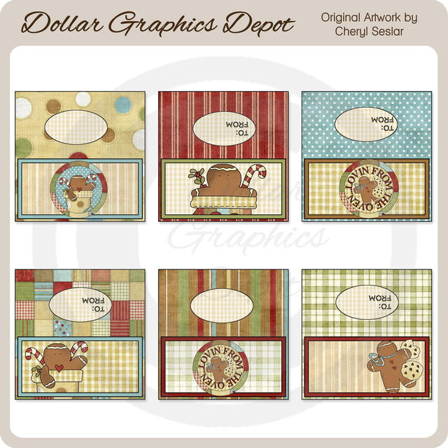 Esta colección incluye seis adornos para bolsas de pan de jengibre caseros con lindos hombrecitos de jengibre, medias navideñas, manoplas navideñas, bastones de caramelo, ramas de bayas de acebo, galletas con chispas de chocolate, marcos acolchados y arte con palabras "Lovin From The Oven". Este juego contiene 6 adornos para bolsas.