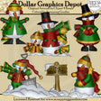 Esta colección incluye siete muñecos de nieve de invierno, vestidos con abrigos, gorros, bufandas y manoplas de invierno, una pala para nieve, una taza de chocolate caliente, una estrella, un regalo envuelto y un cartel de invierno que dice "Es hora de nevar". Los colores incluyen: rojo, verde, dorado, negro y blanco. Este conjunto contiene 6 gráficos.