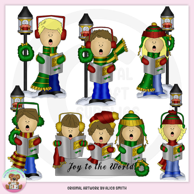 Esta colección incluye ocho niños pequeños, cantando villancicos en un día nevado, cada uno con trajes de invierno, bufandas, gorros, manoplas, orejeras y botas para la nieve, hermosas farolas, con bonitas velas y coronas navideñas, libros de canciones con villancicos y un invierno. cartel que dice "Alegría para el mundo". Los colores incluyen rojo, verde, amarillo, azul, gris, negro y blanco. Este conjunto contiene 6 gráficos.