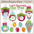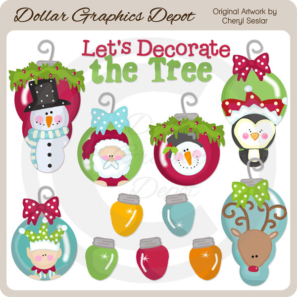 Esta colección incluye seis adornos navideños pintados: Papá Noel, un elfo, un reno, un pingüino y dos muñecos de nieve, cinco bombillas navideñas: amarilla, azul, verde, roja y naranja, y un arte con la palabra "Vamos a decorar el árbol". gráfico. Este conjunto contiene 12 gráficos.